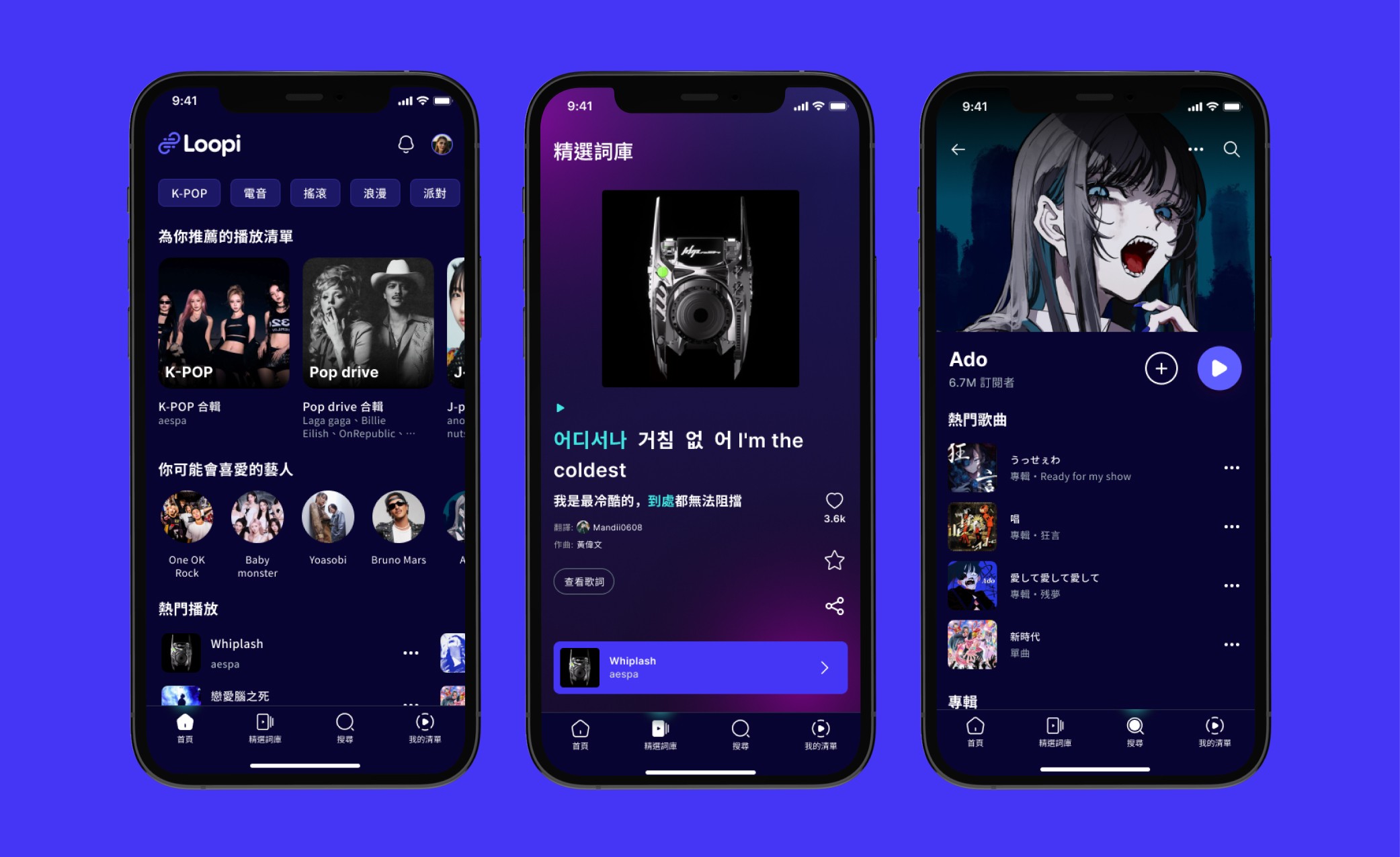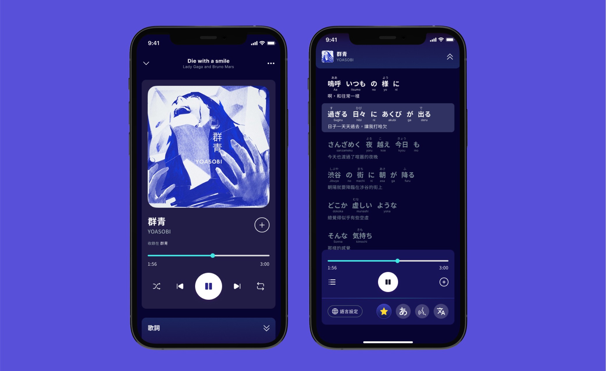 A midnight-violet UI keeps focus on album art while a three-line lyric stack shows original script · phonetic guide · native translation. Users can hide or pin any layer with a thumb-flick.